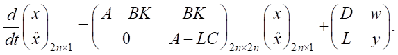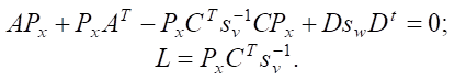 In the presence of external disturbances w(t) and measurement noise v(t) with zero mathematical expectations M[v(t)] = 0, M[w(t)] = 0 and covariance matrices sw and sv, respectively, gain matrix L is determined from the solution to the algebraic Riccati equation (18), and, accordingly, stationary Kalman filter is found:
