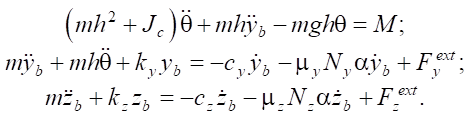 In the vicinity of vertical equilibrium (θ ≈ 0), assumptions are valid: sin θ ≈ θ, cos θ = 1, zb ≈ –mg/kz. Equations (7) are linearized taking into account smallness and