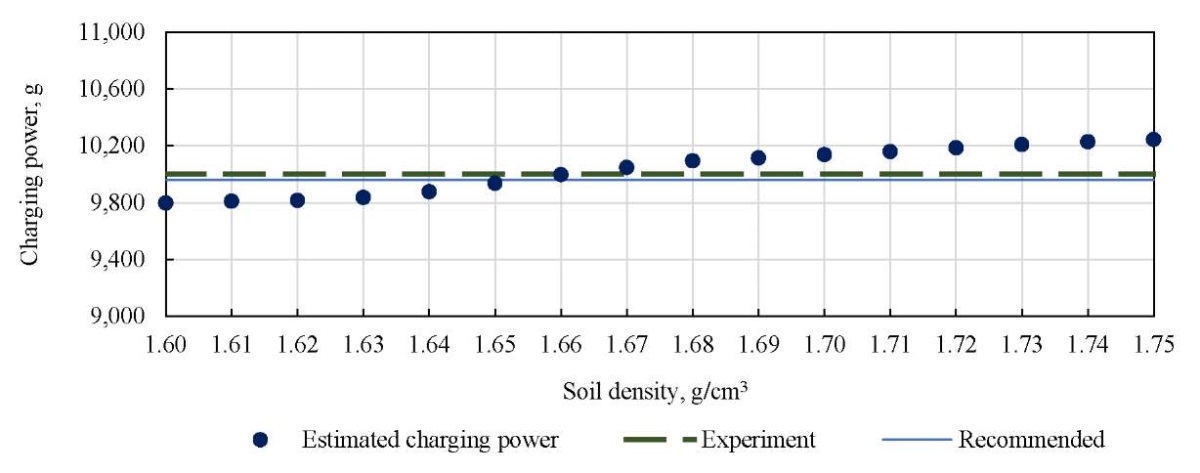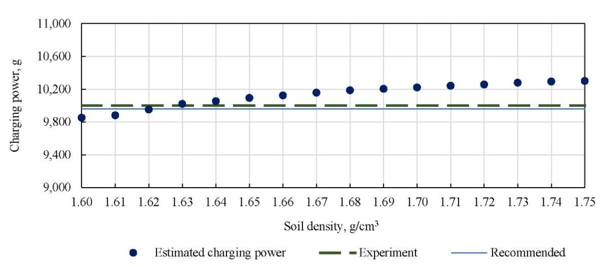 The analysis of the explosive charge power values presented in Table 2 shows that the calculated charge power can take values from 9852.18 g to 10301.24 g. The absolute calculation error does not exceed 0.301. With the average soil density q = 1.66 g/cm³, the absolute error is 123.92 g. The minimum absolute error is 0.02113 at q = 1.63 g/cm³.