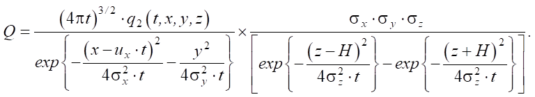 where q(t, x, y, z) — density of compacted soil during a deep blast at time t; u — parameter of horizontal gas propagation; Kxx, Kyy, Kzz — diffusion coefficients; α — parameter of interaction of gas produced by blast and loess subsidence soil; Q — power of explosive charge (i.e., amount of gas ejected by the charge at time t0 at point (x0, y0, z0)); δ — Dirac delta function.