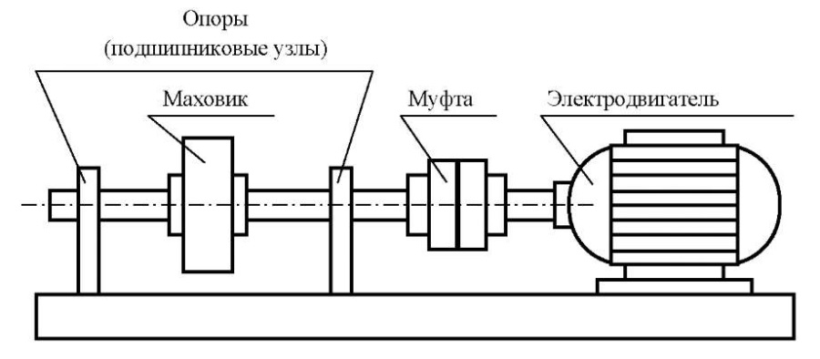 Конструктивно лабораторная установка, схема которой показана на рис. 2, состоит из платформы-основания, на которой крепятся две опоры и асинхронный электродвигатель типа 4А80А мощностью 1,1 кВт с номинальной частотой вращения 1000 об/мин. В опорах на подшипниках качения вращается вал с маховиком. Вал соединён с двигателем с помощью муфты.