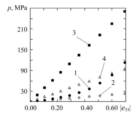 Discussion of Results. According to the calculation results (Fig. 2 and 3), as the magnitude of the compressive strain increases, the required compaction pressure and the degree of compaction of the particle conglomerate rise. The dependence of the compaction pressure on the degree of compaction is clearly nonlinear. The dependence of the compaction pressure on the longitudinal compressive strain (Fig. 2, curve 1) is also described by a nonlinear function, whose behavior is quite adequately approximated by a third-order polynomial function. Figure 2 shows that, at a constant density of the wood particle conglomerate, the curves for the dependence of the compaction pressure on the magnitude of the compressive strain exhibit a weakly nonlinear character. Accordingly, at a fixed density of the medium, the curves for the change in compaction pressure can be approximated by linear functions.