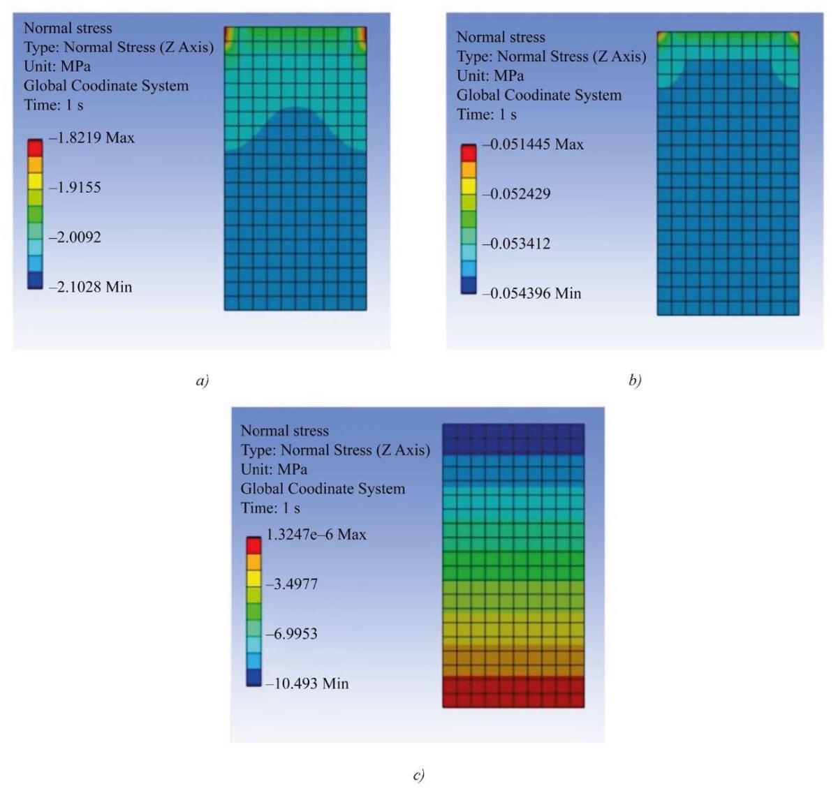 According to the data in Figure 4, the results obtained by the finite element method in solving the direct problem of the first loading stage are consistent with the results obtained in solving the inverse problem, according to the approach proposed in this study. The results presented in Figure 4 clearly demonstrate that the normal stresses and strains along the height are practically the same at each point of the body, which confirms the uniformity of their distribution along the height of the conglomerate under the action of uniform pressure at the upper boundary. It should be noted that in Figure 4 a, b there is a gradient of stresses and strains along the longitudinal axis, which is most likely a consequence of singularity (specifically in the areas highlighted in red) — one of the shortcomings of the finite element method, when there is an incorrect distribution of stresses and strains in the area of corners, with rigid fastenings, etc.
