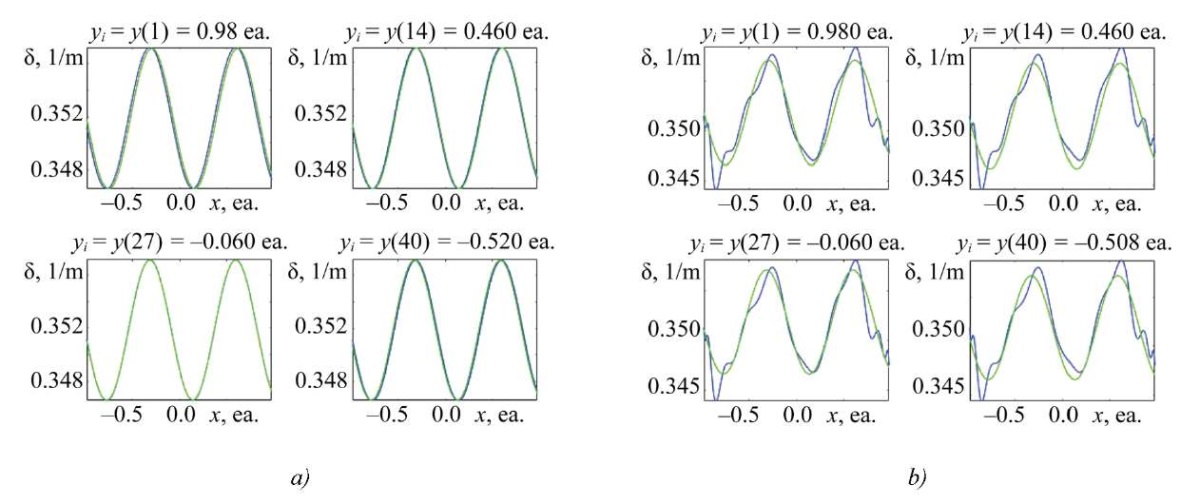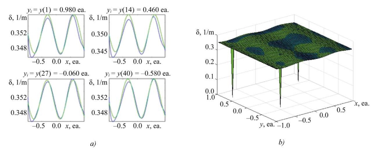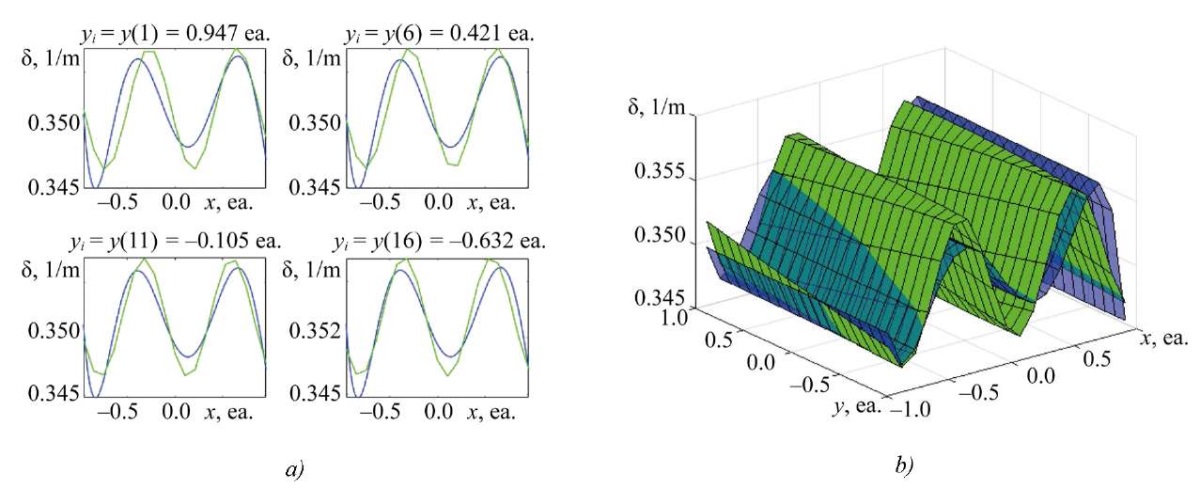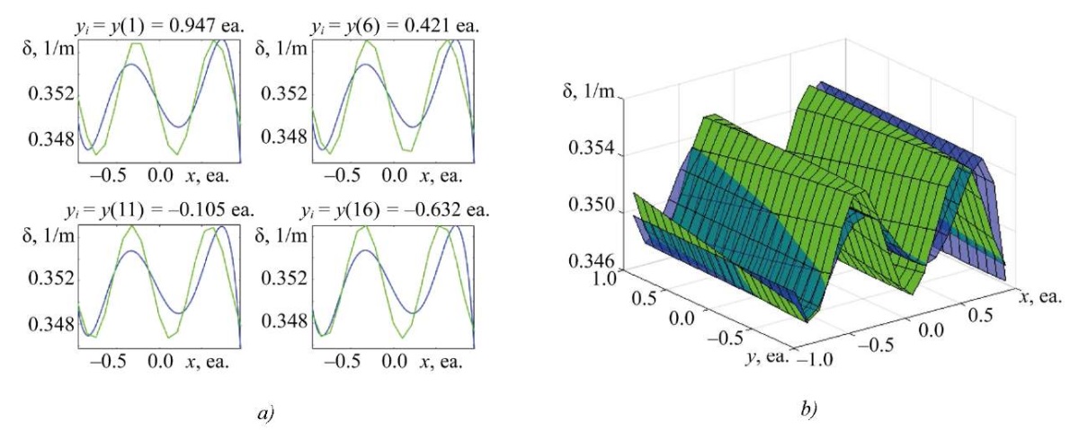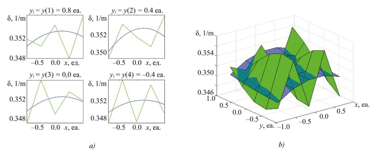 Research Results. Figures 2–5 show comparison graphs of the obtained solutions to uncertain SLAE of different dimensions. In each figure (here and below for similar figures), the absorption coefficient distribution based on the experimental points (linearly connected) and associated with the discretization in the X-axis direction for the Y value is shown in green. The result of the SLAE solution, that is, a polynomial approximation, which is also true for distribution surfaces, is shown in blue. Index i at y in the figure captions denotes the i-th coordinate along axis y.