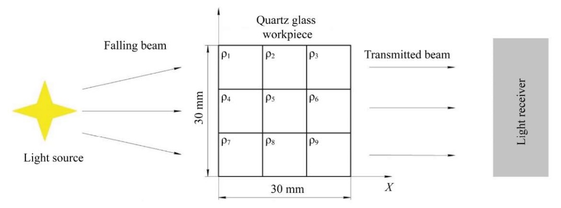 Materials and Methods. A KU-1 quartz glass cube with a 30 mm edge length was used as the test object (as part of a virtual experiment). Inhomogeneity across the volume of the cube was determined through a series of experiments measuring the intensity of a light beam passing through the cube. In this case, for simplicity, the transmission of a beam in the cross-section of the workpiece was considered (that is, a plane problem). Figure 1 shows the computational and experimental setup used to identify the imperfection in the form of inhomogeneity.
