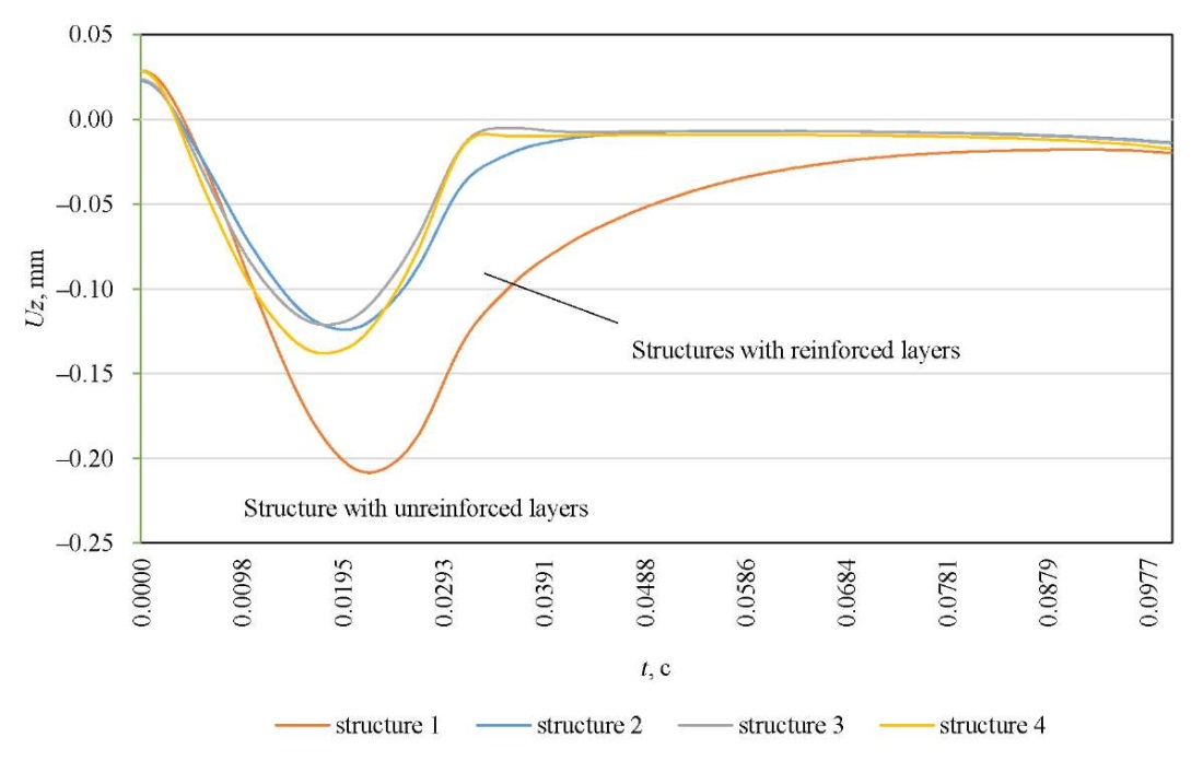 Fig. 6. Calculated amplitude-time characteristics of displacement on the surface of the studied structures