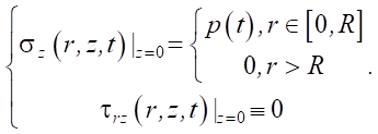 At the boundaries of the layers, conditions of rigid adhesion are set, requiring the continuity of displacements ur(r, z, t) and uz(r, z, t), and stresses σz(r, z, t), τrz(r, z, t).
