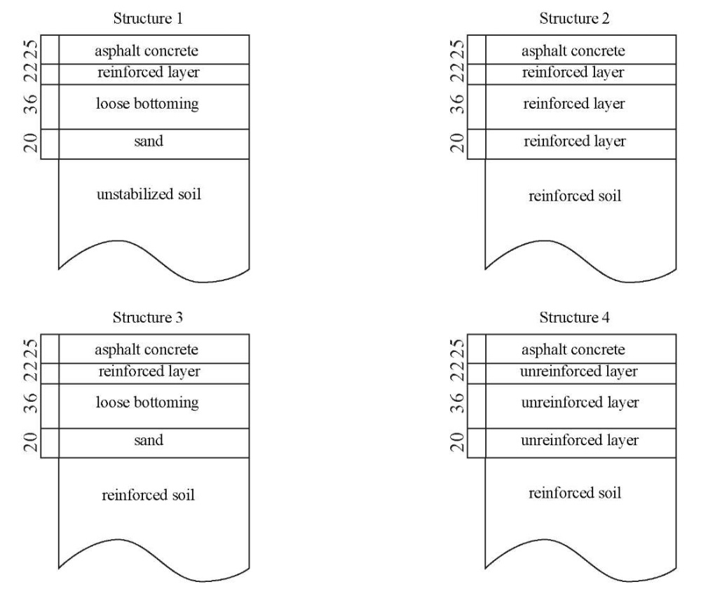 The following road pavement designs are considered during the numerical and experimental studies. Design 1 represents a standard road pavement design in accordance with the current requirements of GOST R 71404: layer 1 is constructed of asphalt concrete, layer 2 is constructed of a crushed stone-sand mixture reinforced with a complex binder, layers 3 and 4 — dry bound macadam, and an antifrost capillary-breaking layer, respectively.