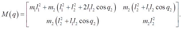 Given link masses m1, m2, lengths l1, l2, and gravity g, the matrices are: