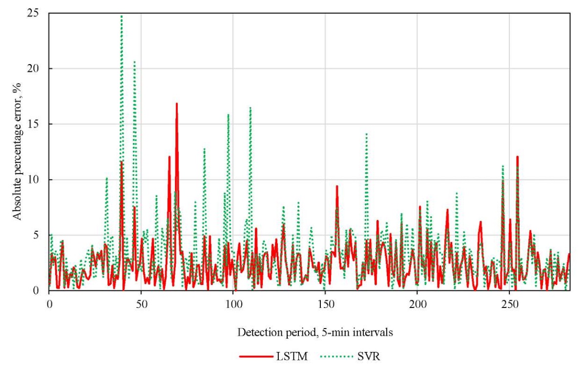 LSTM is also supported by its higher accuracy in periods with both the least error and the greatest one. In the first case, compared to SVR, the LSTM errors were 34.3–42.3% lower, in the second — by 64.4–73.2 %.
