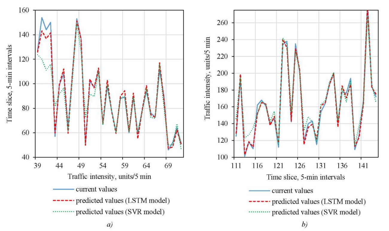 Introduction. With highway congestion increasing, the efficiency of intelligent transportation systems depends on highquality short-term traffic prediction. Statistical methods do not adequately account for nonlinear and dynamic traffic changes. Long short-term memory (LSTM) and support vector machines (SVR) offer more promising solutions. However, they are not ranked in terms of accuracy, as there are no studies comprehensively comparing their adequacy for shortterm traffic flow prediction. The proposed study fills this gap. The research objective is to compare the accuracy of LSTM and SVR, and select the optimal approach for traffic flow prediction on Shenzhen Meiguang Expressway.
