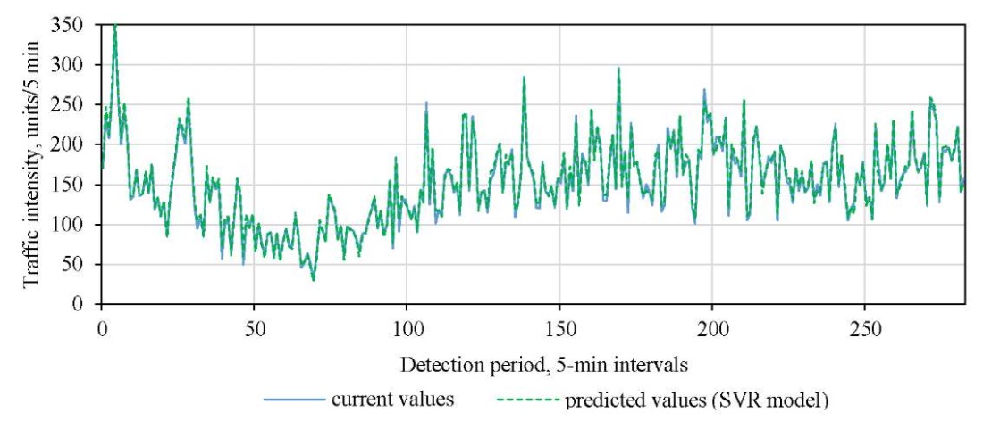 Discussion. Thus, prediction quality depends on the model architecture. Combining interaction variables and lag metrics in the LSTM structure resulted in improved prediction accuracy. Experiments revealed that LSTM outperformed SVR in terms of root-mean-square, mean absolute, and mean absolute percentage errors. This confirmed its superior predictive power under various traffic flow conditions. Flow stability affected prediction accuracy, but LSTM, thanks to its superior time series modeling capabilities, was able to more effectively account for flow temporal dependences and maintain high accuracy even under significant fluctuations. It is worth noting that LSTM not only effectively accounted for traffic flow temporal dependences but also adapted to complex, long-term dynamic changes. Hence — the more accurate results of short-term prediction.