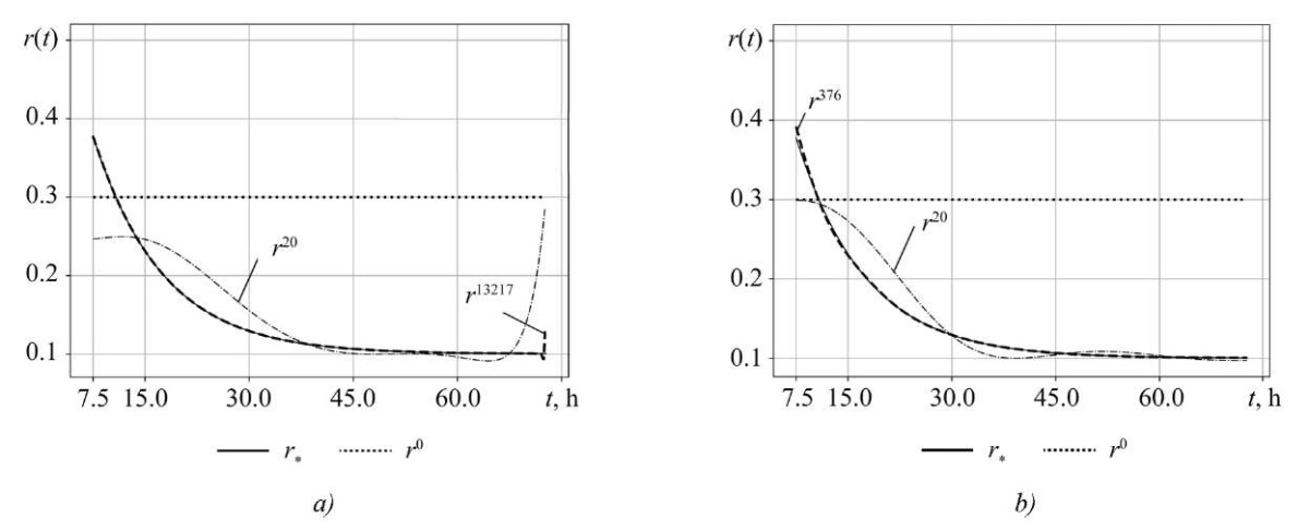 The direct problem for model (1) was solved. The resulting state v(x, t) was taken as the “experimental” ve(x, t). Next, the initial approximation r⁰(t) = 0.3was specified, and the iterative process of solving the inverse identification problem using the extremal algorithm (3) began to recover function .