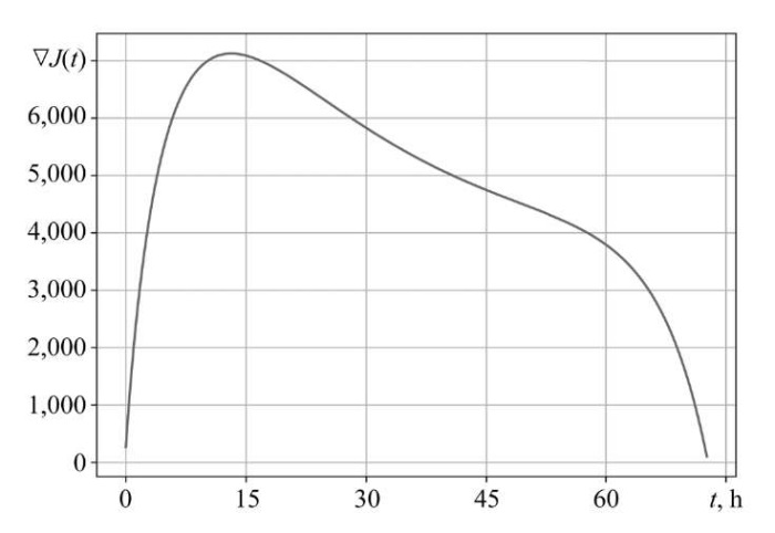 where tΔ, on the one hand, is the waiting time for network users to begin reacting to the published news. Identifying user activity before their reaction is impossible. On the other hand, this is the onset time of the impact of term 2(v – ve) in the adjoint problem on the entire spatial domain of the network cluster under consideration.