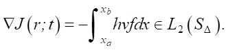 To implement algorithm (3), it is required to find an analytical expression for the gradient of the objective functional (2), which depends implicitly on the control. This is the main difficulty in infinite-dimensional identification. The gradient is found through solving the adjoint problem, the technique for obtaining which is widely described in the literature [13][14].